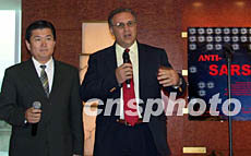 美東僑學各界二十四日下午到中國駐紐約總領館捐贈募捐義款,支持中國兩岸三地抗擊“非典”。圖為美國泰德公司總裁韋伯斯特先生(右)與美國廣西同鄉總會會長喬立華在捐贈儀式上。中新社記者 趙海燕 攝