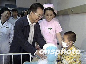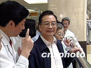 據(jù)中國(guó)中央電視臺(tái)報(bào)道,今天上午9時(shí),溫家寶和中共中央政治局委員、國(guó)務(wù)院副總理吳儀,在中共中央政治局委員、北京市委書記劉淇,北京市代市長(zhǎng)王岐山陪同下,來(lái)到北京兒童醫(yī)院新門診大樓。這里擁有國(guó)際一流的就診環(huán)境和診療手段,日門診量可滿足近萬(wàn)名患兒就診。