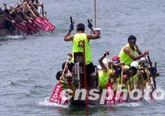 2003年澳門國(guó)際龍舟賽一日在澳門舉行,圖為澳門男子龍舟公開賽初賽中各隊(duì)奮力拚爭(zhēng)。 中新社記者 李剛