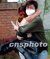北京一位母親六月三日上午在小湯山戰(zhàn)地醫(yī)院門前,終于盼到患“非典”住院一個(gè)多月的兒子痊愈出院,母子頓時(shí)激動(dòng)地緊緊擁抱在一起。中新社記者:賈國榮