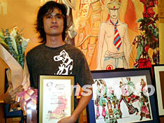“激情英倫時尚”時裝設計大賽(廣州賽區)十一日在中國大酒店舉行頒獎典禮,二十四歲的華南農業大學學生林進亮獲一等獎,他將與北京、上海、和重慶賽區的優勝者進入總決賽,爭奪赴英國留學一年獎學金的大獎。作者:陳文