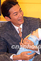 香港藝員江華,六月十五日在香港時代廣場舉行的歡度父親節活動上,風趣示范抱BB做運動一分鍾。錢興強 攝