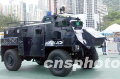 香港警務處2003年6月22日在香港維多利亞公園舉行的“同心攜手畫出彩虹”嘉年華活動上,展示警用“Saxon撒臣裝匣運兵車”。 中新社記者 錢興強