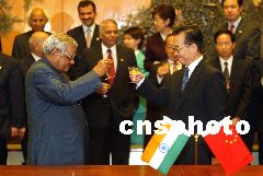 中國總理溫家寶與印度總理瓦杰帕伊二十三日上午在北京人民大會堂舉行會談,并出席中印關于簡化簽證手續的諒解備忘錄等九個文件的簽字儀式。圖為溫家寶與瓦杰帕伊舉杯共賀。中新社記者 毛建軍 攝