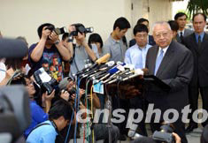 世界衛生組織6月23日將香港剔除出疫區,特首董建華隨即到淘大花園舉行記者會,并向在SARS疫癥中死難者哀悼。 中新社記者 洪少葵