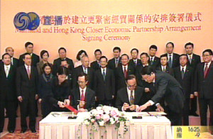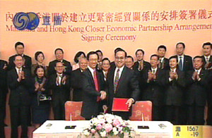 六月十六日,香港特首董建華在正式宣布CEPA月底簽署的消息時這樣說∶“在國家主席胡錦濤、總理溫家寶及副總理吳儀的關心下,香港與內地更緊密經貿關系安排的磋商,已取得重大的實質性進展,雙方已經極接近一致意見,并商定於六月三十日在香港舉行簽署儀式!