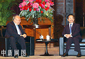 國務(wù)院總理溫家寶6月29日在下榻的酒店,會見特首董建華并與工商界知名人士親切交談。洪少葵 攝