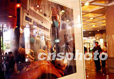 香港一家購物商場展出醫護人員醫治SARS病人的照片,提醒市民不可掉以輕心,預防病毒死灰復燃。洪少葵 攝
