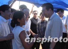 七月五日,國務院副總理回良玉來到安徽阜陽王家壩,看望安全轉移到大堤上的受災群眾.中新社記者:盛佳鵬