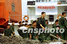 武警戰(zhàn)士八日在上海軌道四號(hào)線搶險(xiǎn)現(xiàn)場(chǎng)加固臨時(shí)防護(hù)圍堰。上海昨日又降大雨,給沙堤內(nèi)側(cè)安置大型鋼制樁的施工還在緊張進(jìn)行中,預(yù)計(jì)完成臨時(shí)防汛墻沿線約三百根鋼制樁的全部安置工作,還將持續(xù)一段時(shí)間。作者:劉殊瑾