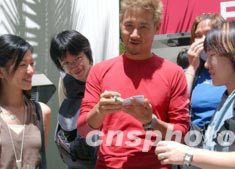 香港歌星張學(xué)友,七月十二日接受香港新城電臺(tái)“家天下”節(jié)目專訪,等候的歌迷爭(zhēng)相請(qǐng)張學(xué)友簽字。中新社傳真 錢興強(qiáng) 攝