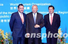 香港特首董建華(中),7月14日在會展中心與博鰲亞洲論壇秘書長龍永圖(右)及世界旅游組織秘書長弗朗加利主持“重振亞洲旅游業會議”開幕禮。中新社記者:洪少葵