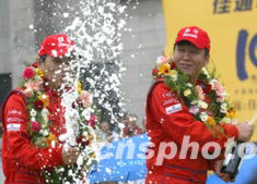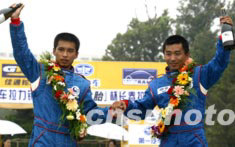 2003年中國汽車?yán)愰L春站比賽經(jīng)過兩天的激烈爭奪17日全部結(jié)束,來自北京慶洋車隊的任志國(右)、和領(lǐng)行員潘劍獲得N2組比賽冠軍。中新社記者:趙振清