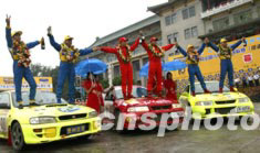 2003年中國汽車?yán)愰L春站比賽17日全部結(jié)束,來自云南紅河車隊的劉斌(右)、領(lǐng)行員黃煜獲得N組比賽冠軍。中新社記者:趙振清
