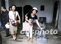 長江三峽蓄水后吸引了許多人的關注。七月中旬,一百多位臺灣游客來到夔門參觀游覽。圖為臺胞在白帝城東碑林撫摸觀音像,從頭摸到手表示家里樣樣有。作者:李中全