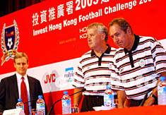香港投資推廣署2003足球挑戰賽將在7月27日在大球場舉行,香港足球總會會長霍震霆、投資推廣署署長盧維思、利物浦領隊侯利亞等7月25日在君悅酒店出席記者會。作者:洪少葵