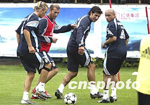 中新社昆明七月二十八日電(記者 沈晨)皇馬抵華訓練進入第四天,貝克漢姆、齊達內、羅納爾多、菲戈、勞爾等大牌球星也逐漸習慣了高原的一切,主教練奎羅斯在今天上午的訓練中安排了相當多的技戰術內容。