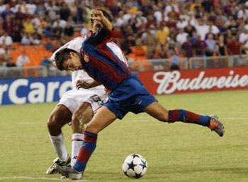 中新網(wǎng)7月31日電 在北京時(shí)間今天上午進(jìn)行的一場(chǎng)國(guó)際友誼賽中,來(lái)自西班牙的巴塞羅那隊(duì)?wèi){借著新加盟的球員夸雷斯馬和羅納爾迪尼奧的進(jìn)球,以2-0擊敗了歐洲冠軍AC米蘭隊(duì)。