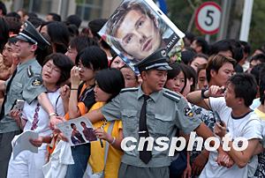從八月一日凌晨開始,眾多北京球迷聚集在皇家馬德里足球隊下榻的北京飯店門前,高聲呼喊戴維、勞爾等人的名字,渴望一睹巨星風采。大批保安人員和警察在門口維持秩序。中新社記者:張煒 毛建軍
