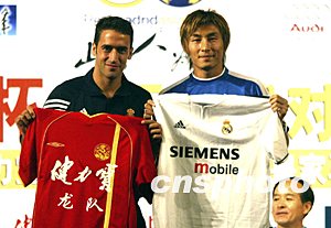 西班牙皇家馬德里足球隊與中國健力寶龍隊八月一日在北京飯店舉行賽前新聞發布會,皇馬隊長勞爾與龍隊隊長李瑋峰在會上互贈隊服。中新社記者:毛建軍
