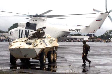 在瓢潑的大雨中,大約300名尼日利亞士兵乘坐兩架聯(lián)合國的直升機(jī)出現(xiàn)在離首都蒙羅維亞45公里的羅伯茨菲爾德機(jī)場。他們手握沖鋒槍,確保機(jī)場安全。