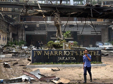 爆炸發生后,濃煙烈火從酒店的地下層冒出來。爆炸已經摧毀了一個酒店里的一家餐廳,酒店的大堂也部分受損。酒店的大堂以及門口停放的8輛汽車在燃燒。酒店及附近一幢高樓的多個樓層窗戶的玻璃被震碎。印尼《羅盤報》的一名記者說:“我看見幾輛出租車在燃燒,我相信是汽車炸彈引起了爆炸。八名受傷的人中有外國人。”