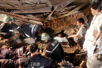 消防人員正在搶救壓在廢墟中的民工李建華