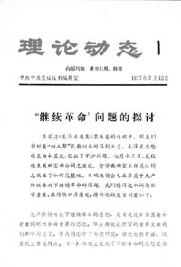 《“繼續(xù)革命”問題的探討》一文,近4500字。文章講了兩個(gè)問題:(一)馬列主義關(guān)于不斷革命的思想是否僅限于由民主革命不間斷地轉(zhuǎn)變?yōu)樯鐣?huì)主義革命的思想,而沒有包括社會(huì)主義條件下的不斷革命思想?(二)無產(chǎn)階級(jí)專政下繼續(xù)革命的對(duì)象、任務(wù)是什么。文章重點(diǎn)是講后面一點(diǎn)。
