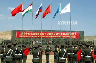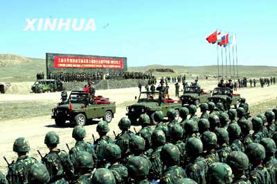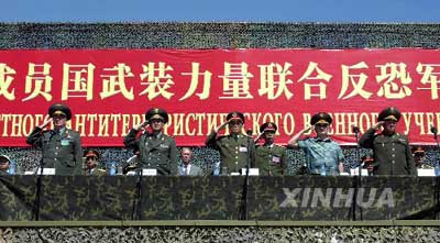 中新網8月13日電 代號“聯合——2003”的上海合作組織成員國武裝力量聯合反恐軍事演習12日在新疆伊寧市附近地區進行了城鎮清剿、解救人質和攻打營地、聯合圍殲恐怖分子的實兵演習后圓滿結束。中央軍委副主席、國務委員兼國防部長曹剛川和各參演國軍事代表團團長在觀摩演習后出席了演習結束儀式并檢閱參演部隊。(文圖來源:新華網)