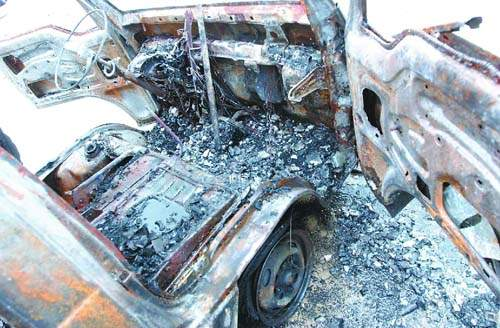 肇事的車子是0.6噸貨車,車上的擋風玻璃已經完全破碎,前兩輪胎處只剩下架子,方向盤只剩下圓形金屬,以及一把土制手槍、一把尖刀。值得一提的是,在車輛的殘骸上還有大量的塑料桶,有的是藍色,有的是白色,據一保安介紹,這些塑料桶是用來裝易燃液體的。昨天上午9時47分,一輛車身標志是“刑事勘察車”的車輛駛入村委會大院,從車上走下來數位警員,現場一共10多名警察不時交談著什么。最后警察將所有證物搬上車子后方離開。
