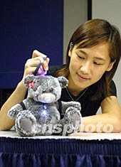香港科技大學物理學系學生,8月14日示范安裝紫外線感應器的熊寶寶玩具,該產品以不同顏色的燈(綠、白、藍、紅)顯示紫外線的強度發出警號。蕭紓昊 攝