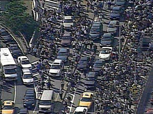 紐約市內街道上擠滿車輛,動彈不得。位于三十四街和第七大道口的賓州車站一片漆黑,街上擠滿了人。