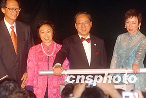 香港政務(wù)司司長曾蔭權(quán)和香港旅游發(fā)展局主席周梁淑怡等,八月十七日為“香江明珠激光匯演”主持啟動(dòng)儀式。中新社記者:錢興強(qiáng)