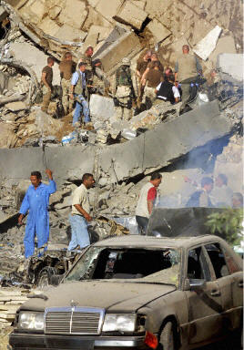 聯(lián)合國雇員告訴福克斯新聞,爆炸發(fā)生時大樓里至少還有150名工作人員。福克斯新聞記者丹-斯普林杰自現(xiàn)場發(fā)回的報道稱,兩層高的“運(yùn)河賓館”有整整一個角被炸掉!據(jù)稱,爆炸的中心位置好象位于賓館的大廳。(章田)