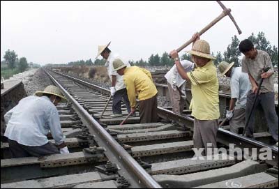 中新網8月20日電 今天,濟南鐵路分局泰安工務段職工在京滬線泰安段曲線半徑改造工程上施工,為第五次大提速做準備。