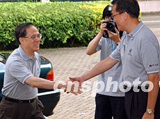 香港警務處長曾蔭培,八月二十一日在香港少年警訊滅罪夏令營活動上,迎候政務司司長曾蔭權。中新社記者:錢興強