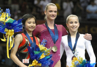 這兩名十七歲的小將不負重望,特別是中國女隊領軍選手張楠狀態(tài)明顯回升,第一項平衡木得了今晚全場最高分九點七分,在自由體操比賽中也穩(wěn)定發(fā)揮。不過由于她跳馬相對較弱,高低杠又出現(xiàn)屈腿的小失誤,只得九點二六二分,最后以三十七點六二四分奪得銅牌。這是迄今中國選手在世錦賽女子全能項目上的最佳戰(zhàn)績。