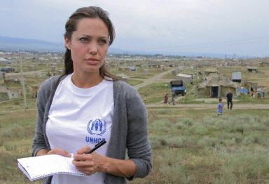 作為聯合國難民事務高級專員公署的“親善大使”,好萊塢影星安吉莉娜·朱莉22日探訪了俄羅斯北高加索地區靠近車臣邊境的貝拉難民營,受到車臣難民的熱情歡迎。朱莉自從2001年被聯合國難民署任命為“親善大使”以來,已經實地訪問了世界多個國家的難民營。