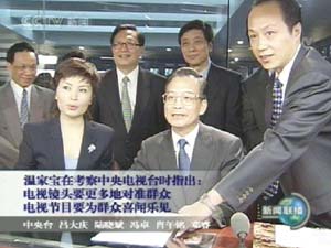 中新網8月26日電 中共中央政治局常委、國務院總理溫家寶今天(26日)下午在考察中央電視臺時指出,電視宣傳要更多地展示改革開放和現代化建設的新成就,電視鏡頭要更多地對準群眾,電視報道要更多地反映廣大群眾的意愿,電視節目要更多地創造廣大群眾喜聞樂見的內容和形式。
