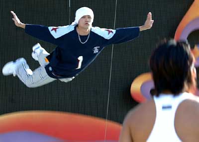 盡管已經到了秋高氣爽的天氣,但是昨天下午的太陽依然跟人較勁。工人體育場上,又出現了和上周一樣的場景——一個是已見雛形的景觀歌劇《阿依達》的巨型金字塔舞臺,另一個就是明天將要在這里上演的周杰倫個人演唱會的豪華舞臺。陽光暴曬下,工作人員正在緊張地忙碌著。舞臺上方,一個籃球架已經安置完畢,屆時它將從上方緩緩降落為小天王支起一個臨時的籃球場,周杰倫將為現場觀眾展示高超的球技。記者看到舞臺上有7個快速升降機,到時候周杰倫可以隨時從舞臺的某一個地方“冒”出來,讓觀眾大吃一驚。下午3:00,頭上包著白色毛巾的周杰倫出現在舞臺上,小天王這個打扮讓記者想到了陜西頭戴白羊肚毛巾的農民。因為在晚會上有“從天而降”的飛行動作,所以主辦方要求他先演習一下,以保證演出萬無一失。周杰倫在工作人員的幫助下系上安全帶,將鋼絲“拴”在腰間。在倒數“1、2、3”之后,站在臺階上的周杰倫騰空而起然后緩緩落在舞臺前方?罩械闹芙軅悇幼鲀灻栏蓛衾,贏得周圍一片掌聲。很少有笑模樣的小天王,這時臉上也不由自主地流露出幾許得意。在周杰倫玩“飛人游戲”的過程中,他的兩個壯碩的黑人保鏢就目不轉睛地站在舞臺上。(張學軍)