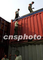 遼寧丹東港邊防檢查站的解放軍九月在丹東市大東港碼頭對集裝箱進行檢查。這個港口與韓國和日本貨運交往每年大幅遞增,由于偷渡人員采用集裝箱躲藏現象較多,邊防武警十分注重對集裝箱的檢查。中新社記者:王麗南
