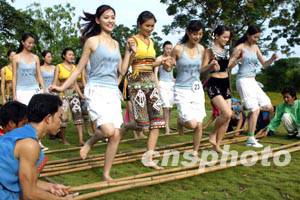 組圖:世界小姐中國總決賽參賽選手學習黎族竹竿舞 (2003-09-17 11:10:13)