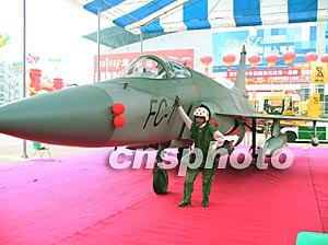“梟龍”殲擊機亮相25日開幕的第四屆中國西博會。這架“梟龍”飛機模型是根據真實的“梟龍”殲擊機以一比一的比例制造而成。圖為一市民穿著飛行員制服與“梟龍”殲擊機親密接觸。作者:陳雯