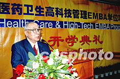 中山大學(xué)醫(yī)藥衛(wèi)生高科技管理EMBA學(xué)位項(xiàng)目的開學(xué)典禮二十六日在廣州中山大學(xué)嶺南學(xué)院舉行,這是中國第一個(gè)獲準(zhǔn)頒發(fā)醫(yī)療服務(wù)方向管理教育(EMBA)學(xué)位的項(xiàng)目。圖為嶺南(大學(xué))學(xué)院董事會(huì)名譽(yù)主席伍沾德先生在典禮上致詞。作者:羅仰明