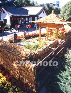 國慶黃金周期間,游客在北京市柳蔭公園玉米亭院前觀賞。玉米庭院主體表面全部用金燦燦的玉米裝飾,展示了豐收景象。作者:曹文