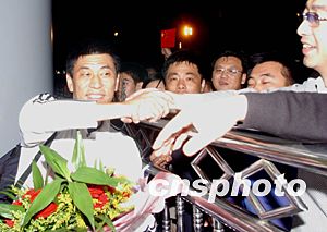 十月四日晚,剛剛抵達北京的中國女子足球隊主教練馬良行在首都國際機場受到球迷們的熱烈歡迎,中國女足雖然沒有完成進軍前四的預定任務,但她們在場上的拼搏精神依然得到球迷的認可。中新社記者:武仲林