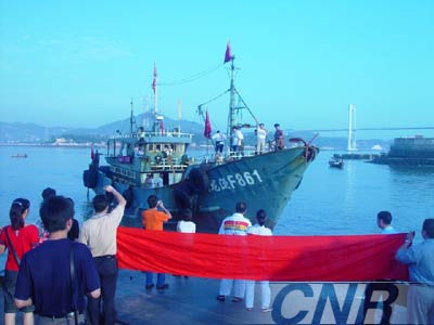 中新網10月11日電 據中廣網報道,10月11日早晨7點,搭載兩岸三地首次攜手保釣行動10名勇士的“閩龍漁F861”號船安全返回廈門東渡漁港。