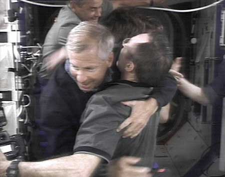 2002年6月7日,美國“奮進”號航天飛機載著幾噸重的補給品、空間建筑材料和來自美、俄、法3個國家的7名機組人員,成功與國際空間站進行了對接。這是“奮進”號機組人員與空間站上的宇航員親切擁抱。新華社圖
