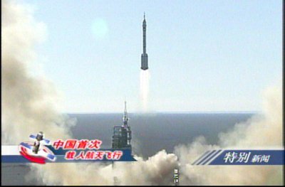 北京時間十五日上午九時整,“神舟”五號載人飛船由“神箭”——“長征二號F”運載火箭從酒泉衛星發射中心載人航天發射場發射升空,“神箭”升空十多分鐘后,中國載人航天工程指揮部總指揮宣布,“神舟”五號載人飛船已成功進入預定軌道,發射取得成功。
