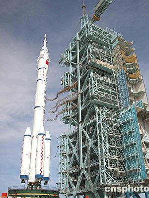 “神舟”五號載人飛船船箭塔組合體順利轉運至發射塔架旁,倚天而立、蓄勢待發。中新社記者孫自法攝
